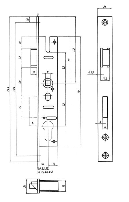 Bever Rohrrahmen-Einsteckschloss ( 3322099051 ) PZW 24/30/72/8 mm DIN links / rechts Riegelausschluss 11 mm 244 mm