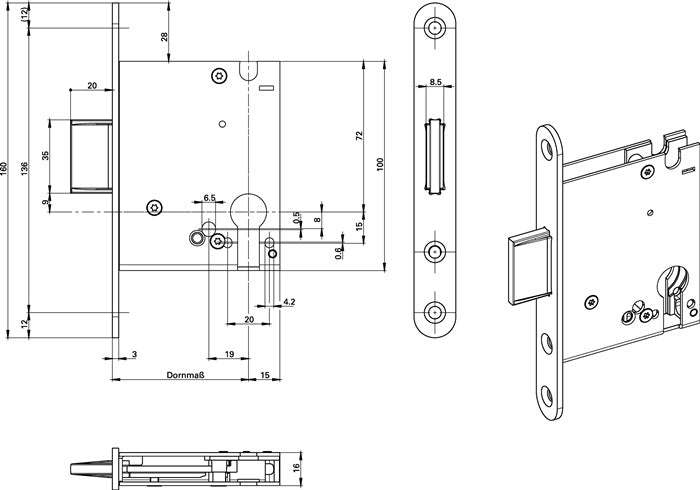 PZ Ausführung · allseitig geschlossener Schlosskasten · 1-tourig 20 mm · Stulplänge 160 mm · Dornmaß 55 mm · DIN links / rechts verwendbar · Riegel aus Zinkdruckguss · ohne Schließblech