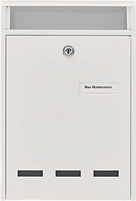 Standardmodell für geschützte Eingangsbereiche · aus verzinktem Stahlblech · ohne Einwurfklappe · mit Sichtschlitzen · weiß