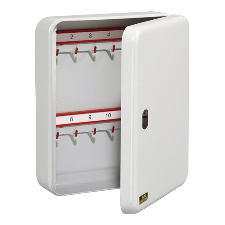 CityLine · solide Schlüsselbox · mit Messing-Stiftzylinder · Hakenleisten fortlaufend nummeriert · Hakenköpfe mit roten Kunststoffkäppchen gesichert · Papierstreifen rückseitig neutral, für eine individuelle Beschriftung · lichtgrau (RAL 7035) · Hakenabstand: 30 mm · Version V-PZ · vorgerichtet für Profil-Halbzylinder · ohne Zylinder · integrierbar in Schließanlagen · wichtig: Die Schließnase muss bei 90° links arretierbar sein · Hakenabstand: 30 mm