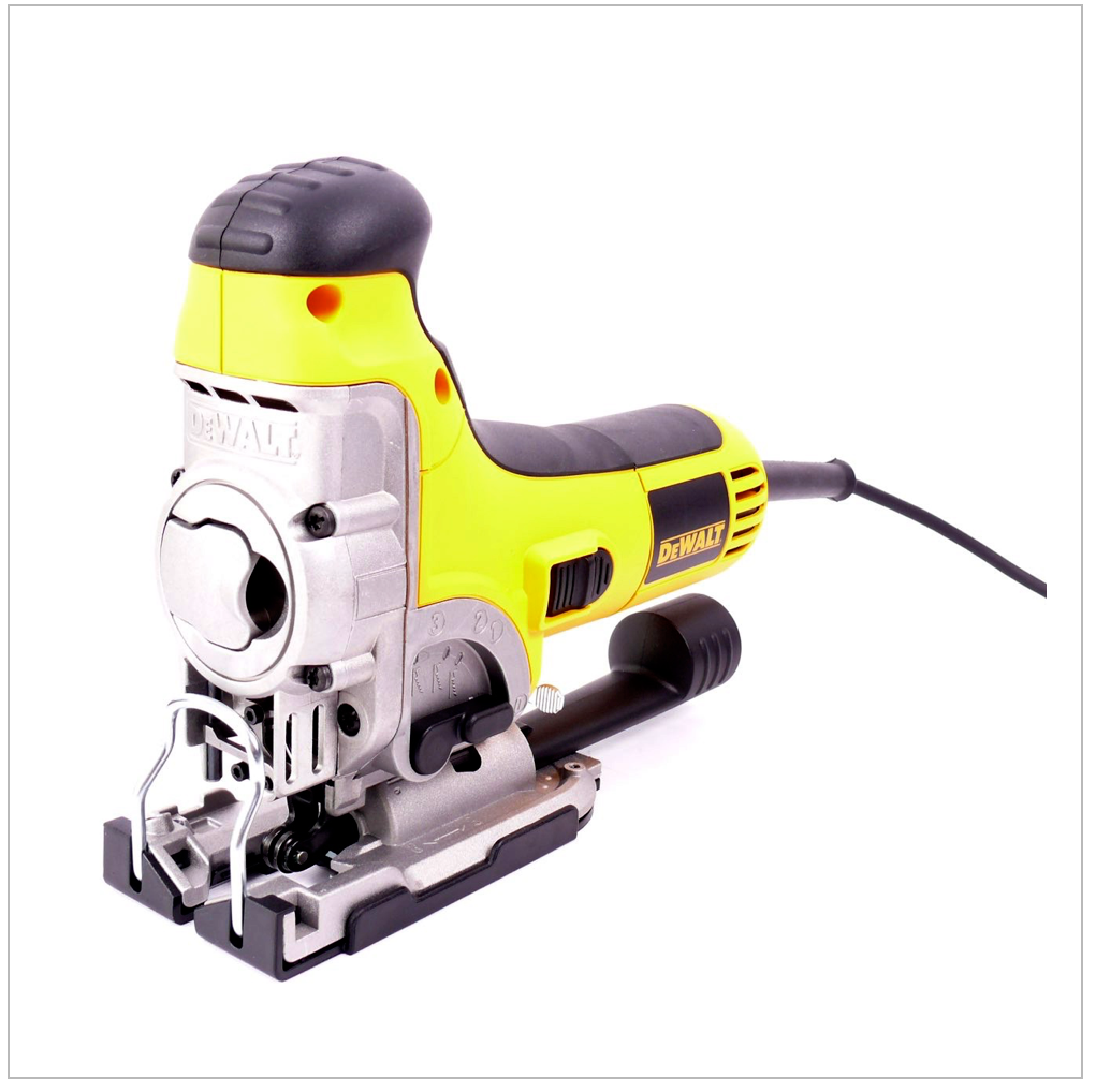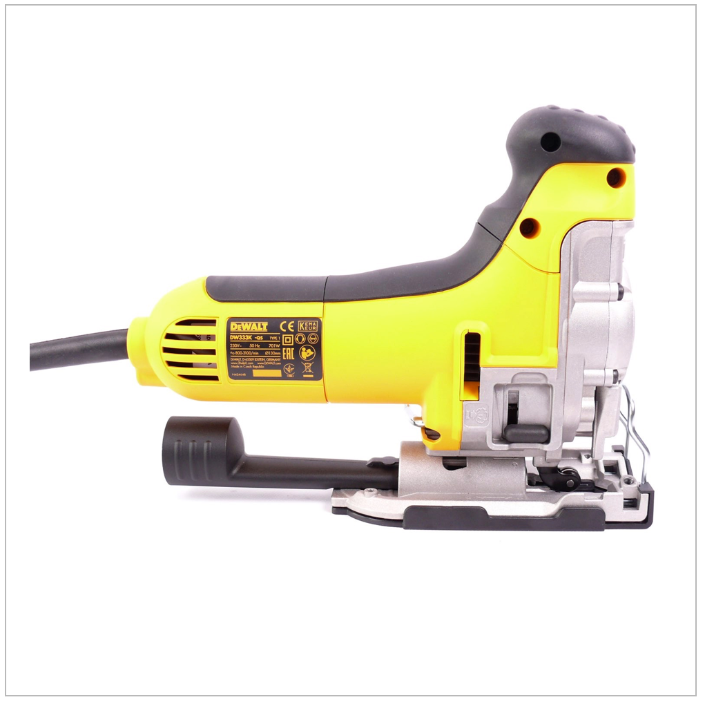 Die DeWalt DW 333 Pendelhub-Stichsäge überzeugt mit Hochleistungsmotor mit Vollwellenelektronik und elektronischer Hubzahlregulierung. Der Sägeblattwechsel ist werkzeuglos und besonders einfach durchzuführen, das Gerät verfügt über eine dreistufige Pendelhubsteuerung für besonders saubere Schnittergebnisse. Die Blasvorrichtung und die effektive Staubabsaugung garantieren freie Sicht auf den Anriss. Das Handling wurde durch den gummierten Griff und das besonders vibrationsarme Hibstangenantriebssystem deutlich erhöht.
