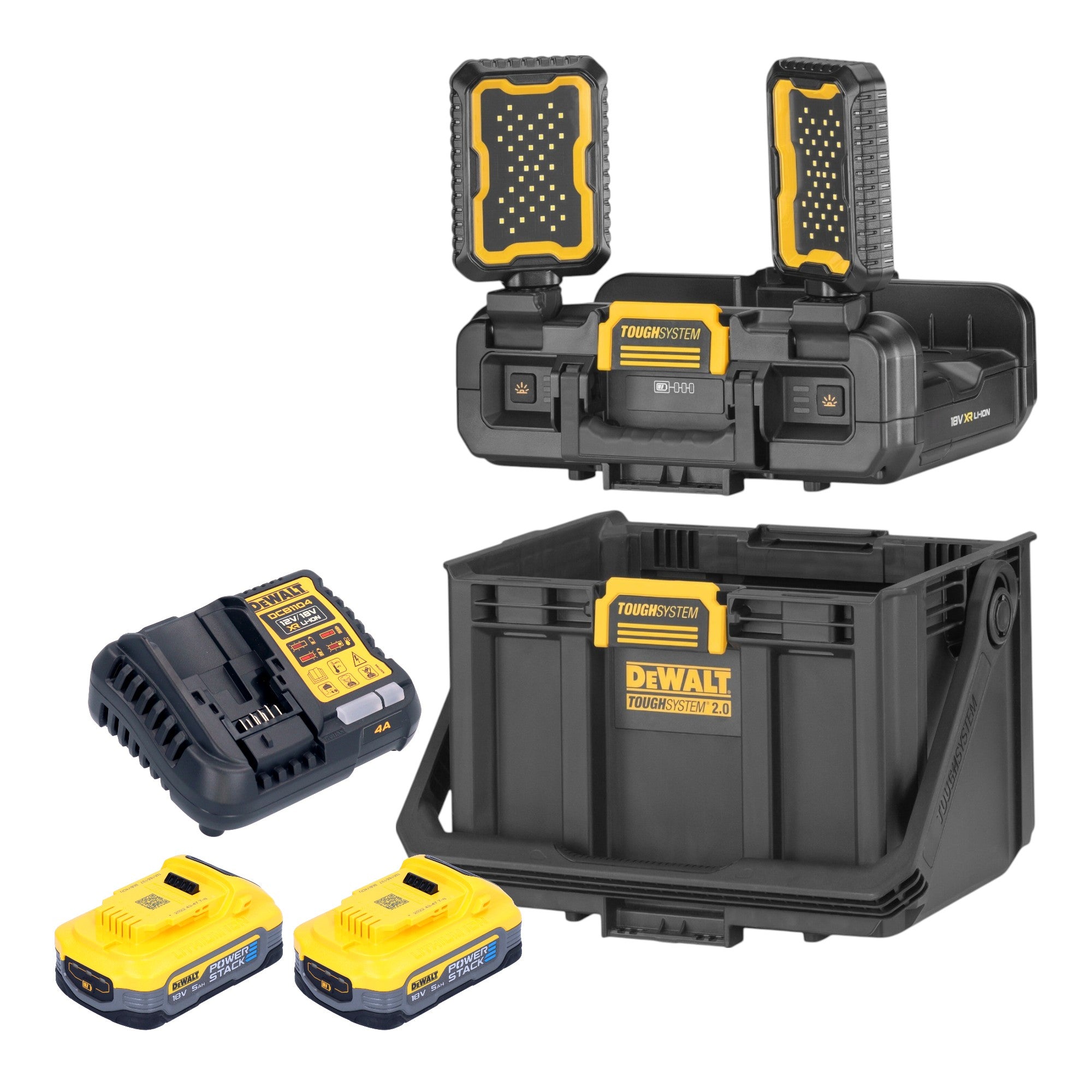 DeWalt DWST08061-1 Werkzeugbox mit integrierten Leuchten 395 x 352 x 255 mm ToughSystem 2.0 + 2x Powerstack Akku 5,0 Ah + Ladegerät