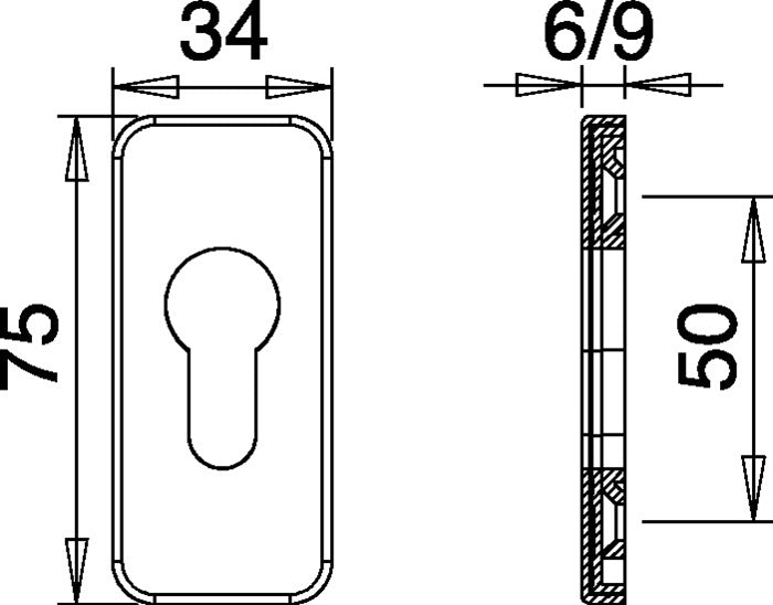 für Rahmentüren · Lochung PZ · Höhe 74,5 mm · Breite 34 mm · unsichtbare Verschraubung · Lieferung ohne Schrauben