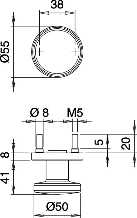 aus Edelstahl · auf runder Rosette · gerader Knopf · Rosetten-Ø 55 mm · Höhe 41 mm · Rostetten-Stärke 8 mm · Schraublochabstand 38 mm