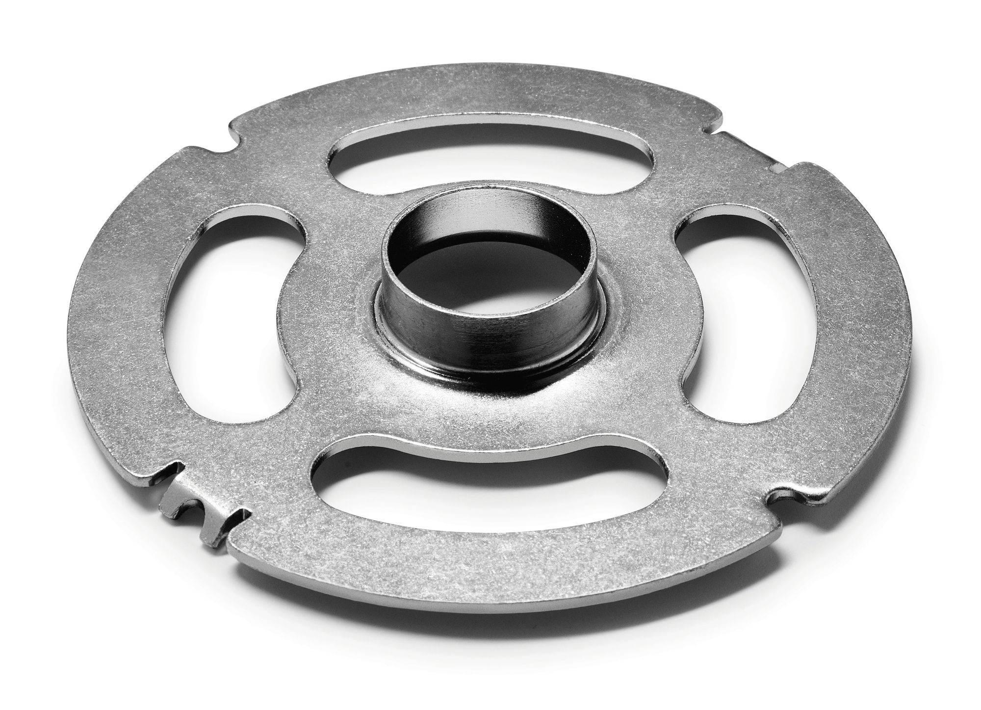 Kopierring zur sicheren Führung der Oberfräse beim Fräsen mit einer Schablone. Hierbei spielt es keine Rolle, welche Form die Schablone hat.