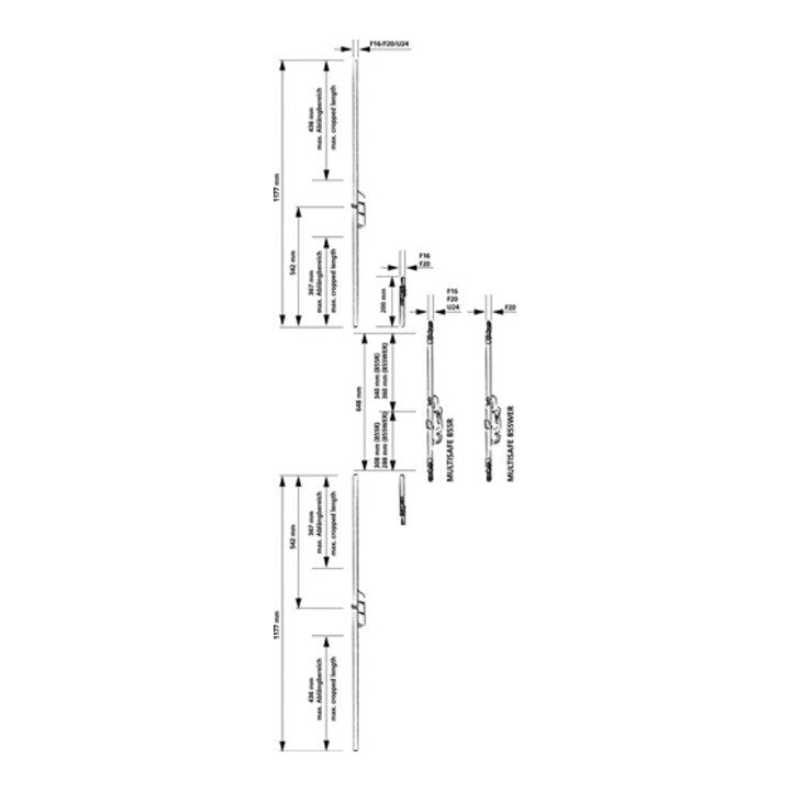 1 Bolzenriegel · Länge 1177 mm · Ablängbereich: Nussmitte bis Bolzen unten= 850-650 mm, oben 730-515 mm