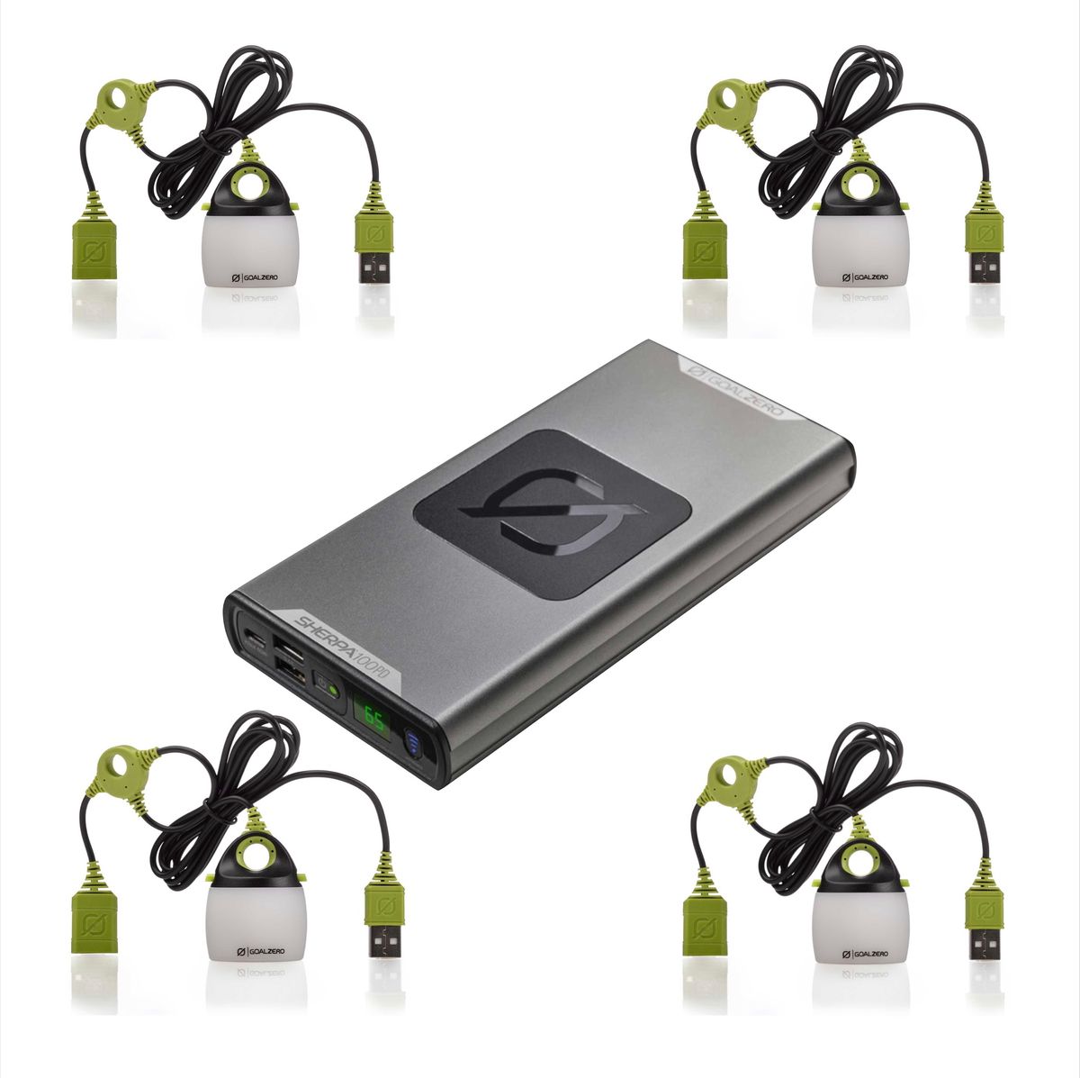 Goal Zero Sherpa 100 PD Powerbank Wiresless Qi Charging 14,8 V 6,4 Ah + 4x Light a Life Mini USB Chainable Light 110 Lumen