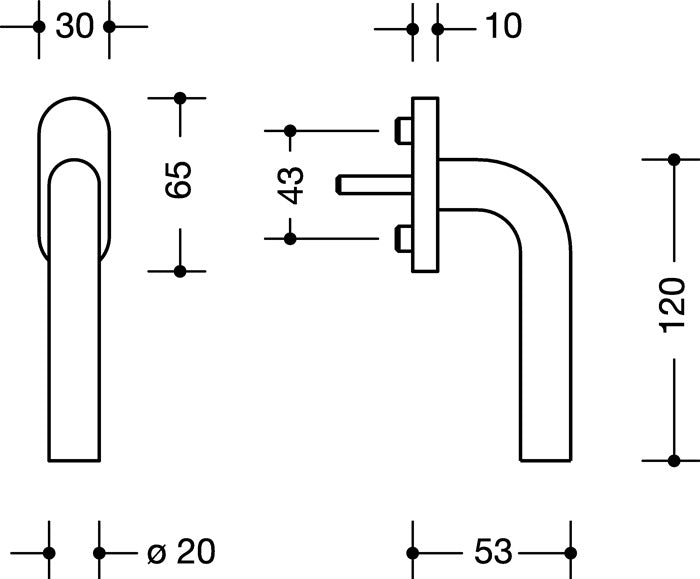 aus Polyamid, Durchmesser 20 mm, 120 mm lang, mit 90 Grad-Rastpunkten und 7 mm Vollstift, Länge 30 mm vorstehend. Vormontiert auf Ovalrosette 65 x 33 mm, mit Stützzapfen Durchmesser 10 mm, verdeckte Verschraubung, Schraublochabstand 43 mm, Abdeckkappe aus Polyamid. Lieferung ohne Befestigungsschrauben · Artikel: HEWI 111FG.6