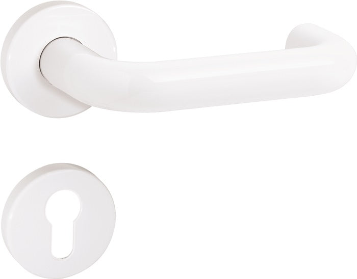 in R-Technik mit Rosetten nach DIN 18255 und DIN EN 1906 aus Polyamid, Oberfläche hochglänzend, bestehend aus: Türdrücker in U-Form aus Polyamid mit durchgehendem Stahlkern bis in das Drückerende, durchgängig eingefärbt, Durchmesser 23 mm, mit Ansatzführung und Rastnut, Montage durch einfaches Einrasten der Türdrücker in die auf der Tür vormontierten Unterteile. Die Rastung kann mittels Demontageschlüssel wieder gelöst werden. Der Drücker erfüllt die Vorgaben der DIN EN 179 und DIN 18040. Rosettenunterkonstruktion in Kunststoff-Edelstahlverbundbau, DIN links und DIN rechts verwendbar. Festdrehbarlagerung der Drücker mit selbsttätig einrastender Rundumverriegelung und 5 mm Lagerstelle als wartungsfreies Gleitlager mit elastischem Ausgleichsbereich und zweiter Lagerstelle im Drückerhals. Verdeckte, lockerungssichere Verschraubung mit M4 Schrauben- und Hülsenschraubenkombination sowie Stützzapfen. Rosetten-Abdeck-Kappe, rund, aus Polyamid durchgängig eingefärbt, Durchmesser 55 mm, 13 mm hoch, gewölbt, 1,5 mm Wandstärke. Lochung PZ Ausgelegt und geprüft für den Objektbereich, Benutzerkategorie nach DIN EN 1906 - Klasse 4 Feuerschutzgarnitur mit Vierkantstift 9 mm, nach DIN 18273 · Drückergarnitur · Drückerlänge 150 mm