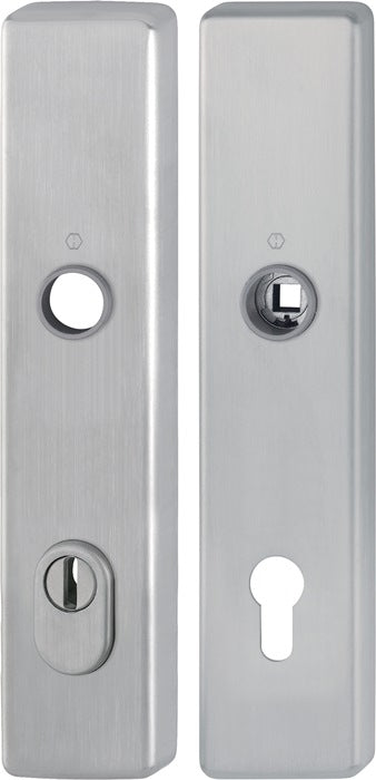 mit Zylinder-Abdeckung für Außen-/Wohnungsabschluss-Türen · zertifiziert nach DIN 18257 ES1, erfüllt die Anforderungen nach DIN EN 1906: 37-0142A (SK2) in Verbindung mit den passenden Türgriffen, Objekt-Garnitur · Gebrauchskategorie Klasse 3 Lagerung: für Türgriffe lose, Rückholfeder rechts/links verwendbar, wartungsfreie Gleitlager Verbindung: HOPPE-Vollstift für HOPPE-Schnellstift (Lochteile) Zylinder-Abdeckung: gehärteter Stahl, für vorstehende Zylinderlänge 10-18 mm Unterkonstruktion: außen Stahl, innen Aluminium, Stütznocken Befestigung: verdeckt, durchgehend, Gewindeschrauben M6 Das Schutz-Langschild-Paar ist ausschließlich mit HOPPESchnellstift-Türgriff-Lochteilen kombinierbar und entspricht nur so den Anforderungen der Schutzklasse ES1 (SK2).
