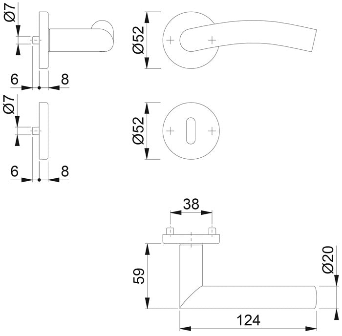 Rosetten-Garnitur mit Schlüsselrosetten · geprüft nach DIN EN 1906: 37-0140A (Gebrauchs-Kategorie Klasse 3), Objekt-Garnitur · Lagerung: Türgriffe lose, Rückholfedern rechts/links verwendbar , wartungsfreie Gleitlager · mit Schnellstift-Verbindung bei D/D mit HOPPE-Vollstift (Loch-/Lochteil), bei K/D mit HOPPE-FDW-Vollstift (Lochteil)· Unterkonstruktion: Kunststoff, Stütznocken · Befestigung: verdeckt, durchgehend, wechselseitig, Mehrzweckschrauben ACHTUNG: bei Wechselgarnituren bitte auf DIN rechts oder links achten!