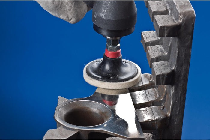 - Anwendungsempfehlung: COMBIDISC-Filzronden mit Schleifblatthalter auf Biegwellenantrieben mit Winkelhandstück, kleinen Druckluft- oder Elektrowinkelschleifern einsetzen. Für den Werkstoff geeignetes Schleiföl verwenden, um die Standzeit und Schleifleistung der Werkzeuge deutlich zu erhöhen. Beim Wechsel der Polierpaste eine neue, unbenutzte Filzronde einsetzen. Für beste Leistung bei einer empfohlenen Schnittgeschwindigkeit von 5–10 m/s einsetzen. Hierbei wird ein idealer Kompromiss zwischen Polierleistung, Temperaturbelastung des Werkstückes und Werkzeugverschleiß erreicht.