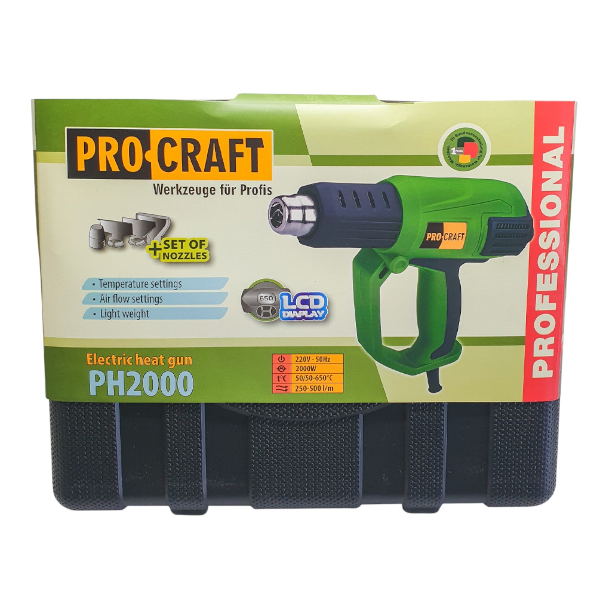 Procraft PH2000 Heißluftpistole 2000 Watt 50 - 600 °C + 4x Düse + Koffer