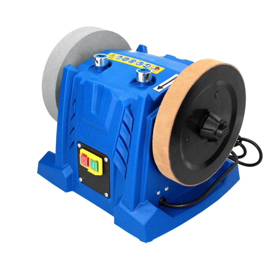 Der Scheppach Tiger 5000S Nassschleifsystem macht das Schleifen und Polieren für jeden Handwerker kinderleicht, ohne viel Übung und Erfahrung. Der 150 Watt Induktionsmotor macht das Arbeiten ruhig und angenehm durch die verringerten Vibrationen. Mit der Winkelehre trifft man immer den richtigen Schleifwinkel und der spezielle Korund Schleifstein mit Aluminiumoxyd sorgt für perfekte Ergebnisse auch bei hartem Stahl. Des Weiteren ist der verbaute Wassertank bruchsicher. Scheppach ist bekannt für gute Konzepte und ausgereifte Technik.
