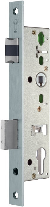 Durchgangsfunktion D für einflügelige Rahmentüren · Ausführung APD (nach Öffnung von Innen bleibt die Tür bis zur erneuten Verriegelung in beiden Richtungen begehbar) · Schlosskasten aus Stahl oben und unten geschlossen · durchgehende Beschlagbohrung oberhalb der Schlossnuss · Späneschutzhülsen · 1-tourig mit stabilem Riegel · Riegelausschluss 21 mm · DIN links und rechts einwärts/auswärts beachten · vorgerichtet für Profilzylinder, mit Wechsel · Stulplänge 245 mm · 9 mm geteilte Schlossnuss · Falle mit Geräuschdämpfung · Riegel vernickelt · Edelstahl-Stulp auf Mitte · Stulplänge 245 mm · käntig · Hinterdornmaß 15 mm · Klassifizierungsschlüssel nach EN 12 209 vorhanden · geprüft und zertifiziert nach EN 1125 und EN 179 gem. Konformitätszeugnis