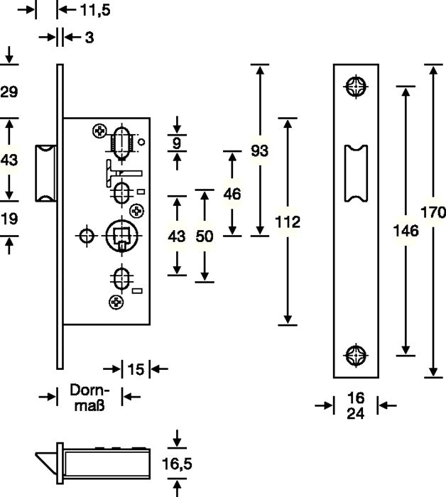 nach DIN 18251-2 · Schlosskasten aus Stahl oben und unten geschlossen · käntig · Stulp Edelstahl · Stulplänge 170 mm · Vierkant 8 mm · DIN Links / Rechts verwendbar · Falle aus Zinkdruckguss · ohne Schließblech