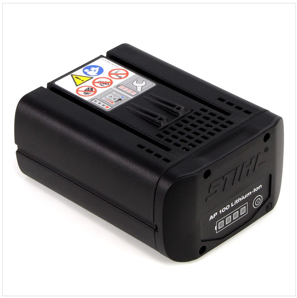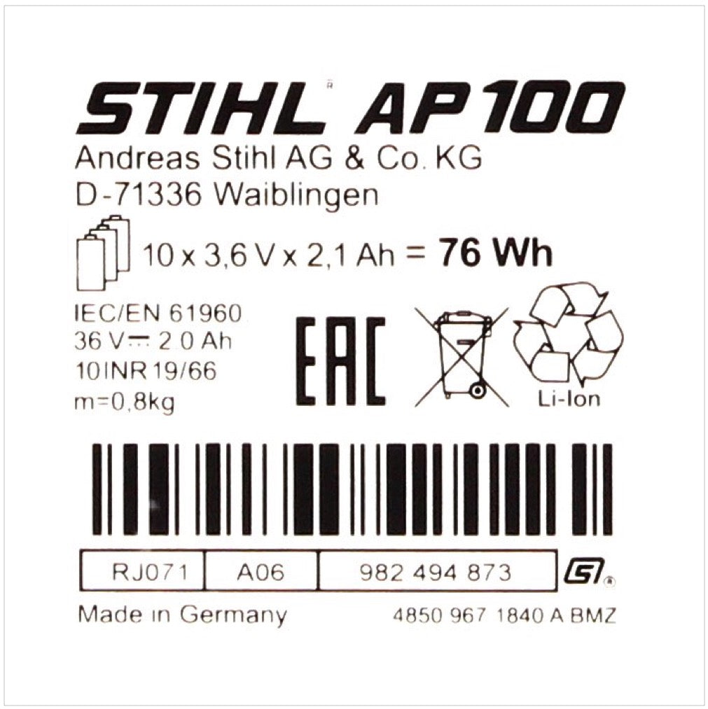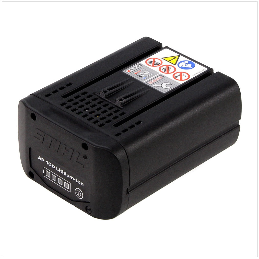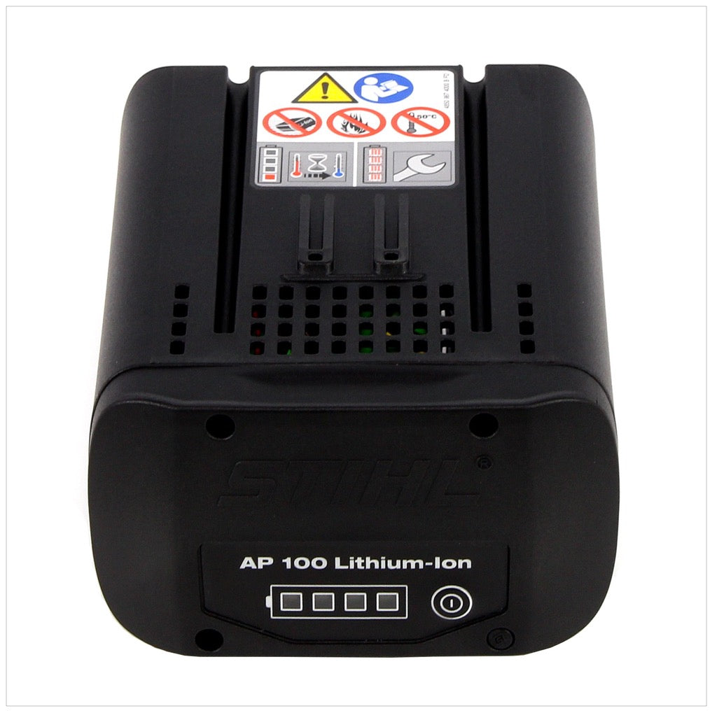 Der Stihl AP 100 Akku besitzt eine Akkukapazität von 2,1 Ah. Er eignet sich für alle 36 V Geräte aus dem Hause Stihl und ist mit den Ladegeräten AL 100, AL 300 und AL 500 ladbar. Außerdem besitzt der Akku eine vierstufige LED Ladezustandsanzeige.