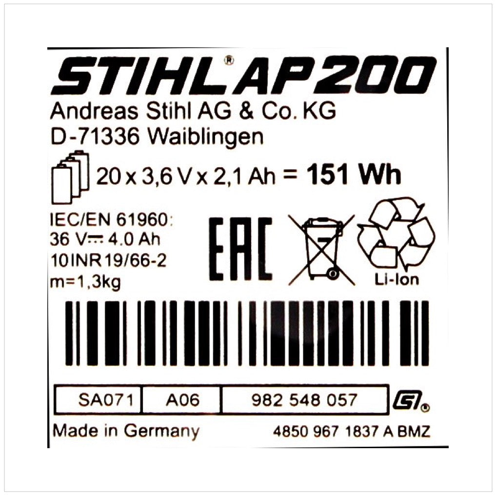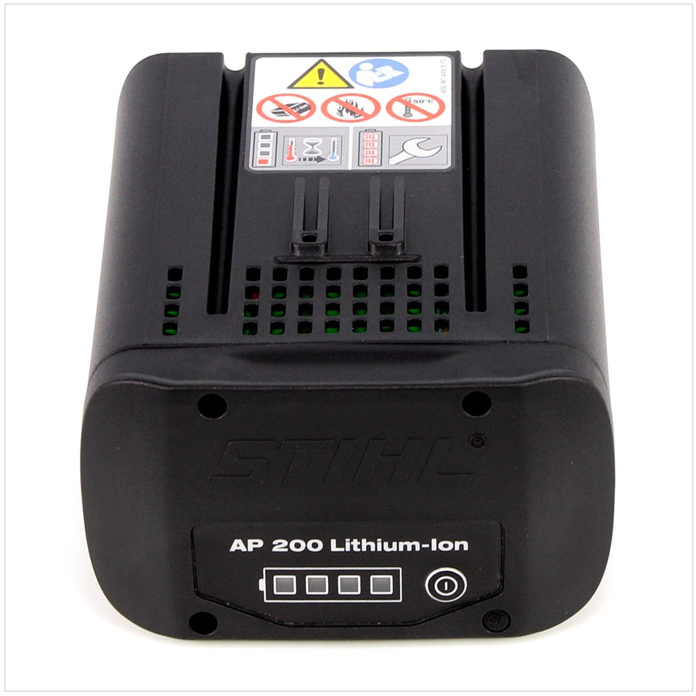 Der Stihl AP 200 Akku besitzt eine Akkukapazität von 4,2 Ah. Er eignet sich für alle 36 V Geräte aus dem Hause Stihl und ist mit den Ladegeräten AL 100, AL 300 und AL 500 ladbar. Außerdem besitzt der Akku eine vierstufige LED Ladezustandsanzeige.