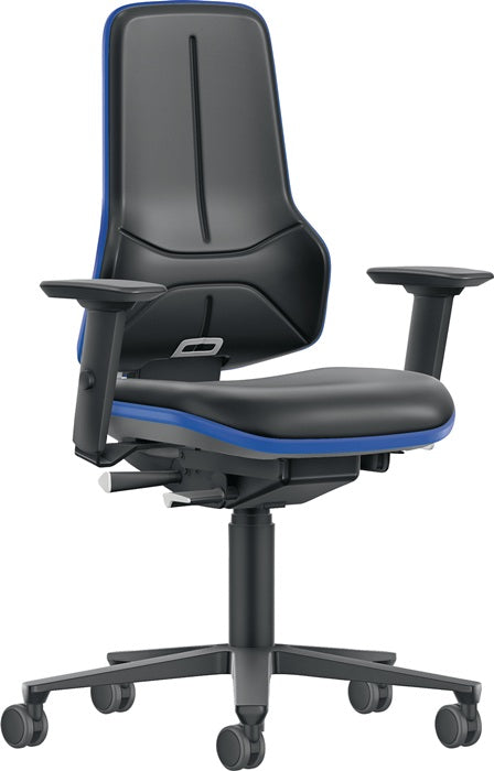 in conformità alla norma DIN 68877 - sedia da lavoro pesante con portata fino a 180 kg - regolazione dell'altezza del sedile con molla a gas di facile utilizzo - sedile e schienale di forma ergonomica con rivestimento in pelle sintetica spessa, lavabile, resistente ai disinfettanti, tecnologia sincrona con regolazione del peso da 80 a 180 kg - sedile regolabile in altezza e profondità - schienale regolabile in altezza (60 mm) - fascia flex blu - struttura di base con robusto basamento in alluminio e doppie ruote di sicurezza frenate in funzione del carico per pavimenti duri