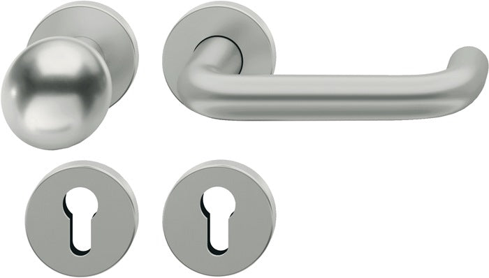 Cuscinetto a norma ASL® certificato EN 1906 classe 4 - predisposto per porte di spessore 39 - 58 mm - quadro 8 mm - rosone rotondo con camma di supporto e molla di ritenuta - utilizzabile DIN sinistra/destra - materiale di fissaggio incluso per il montaggio a vite continua - raccordo intercambiabile con pomolo 23 0802