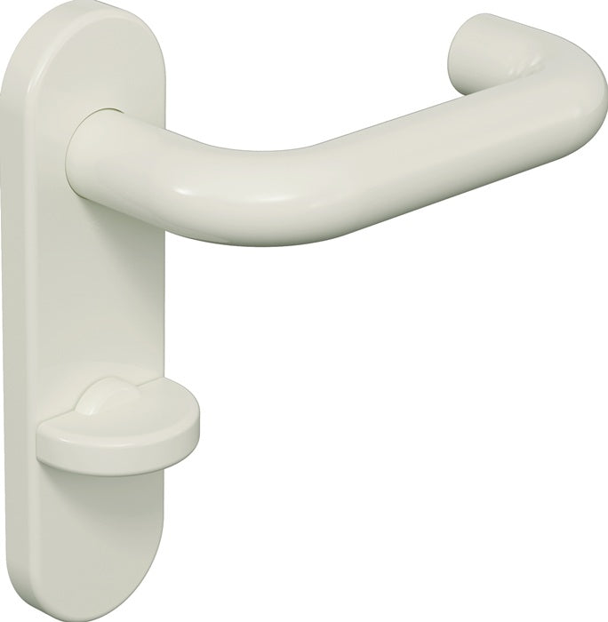 in tecnologia R con piastra posteriore secondo DIN 18255 e DIN EN 1906 in poliammide, superficie lucida, composta da: Maniglia a leva a U in poliammide con anima continua in acciaio fino all'estremità della maniglia, interamente colorata, diametro 20 mm, con guida per l'aletta e scanalatura per lo scrocco, installazione mediante semplice inserimento a scatto della maniglia a leva nelle parti di base premontate sulla porta. Il meccanismo di chiusura può essere sbloccato nuovamente con una chiave di smontaggio. La maniglia a leva soddisfa i requisiti delle norme DIN EN 179 e DIN 18040. Sottostruttura della maniglia in materiale composito plastica/acciaio inox, utilizzabile sia a sinistra che a destra. Cuscinetto fisso della maniglia a leva con bloccaggio automatico su tutti i lati e punto di appoggio da 5 mm come cuscinetto a strisciamento esente da manutenzione con area di compensazione elastica e secondo punto di appoggio nel collo della maniglia a leva. Vite di fissaggio nascosta e antiallentamento con combinazione di vite M4 e vite a bussola e perno di supporto. Coperchio della maniglia in poliammide, interamente colorato, 46 x 180 mm, altezza 13 mm, curvo, spessore parete 1,5 mm. Progettato e testato per il settore contract, categoria d'uso in conformità alla norma DIN EN 1906 - raccordo di classe 4 con mandrino quadrato da 8 mm - lunghezza della maniglia a leva 138 mm - raccordo della maniglia a leva - distanza 78 mm