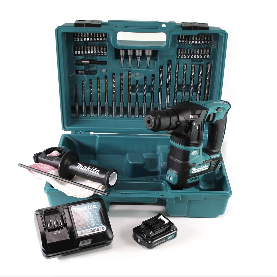 Makita HR 166 DWA1E1 Akku Bohrhammer 10.8V SDS-Plus Brushless + Koffer + 64-tlg. Zubehörset + 1x Akku 2,0Ah + 1x Ladegerät