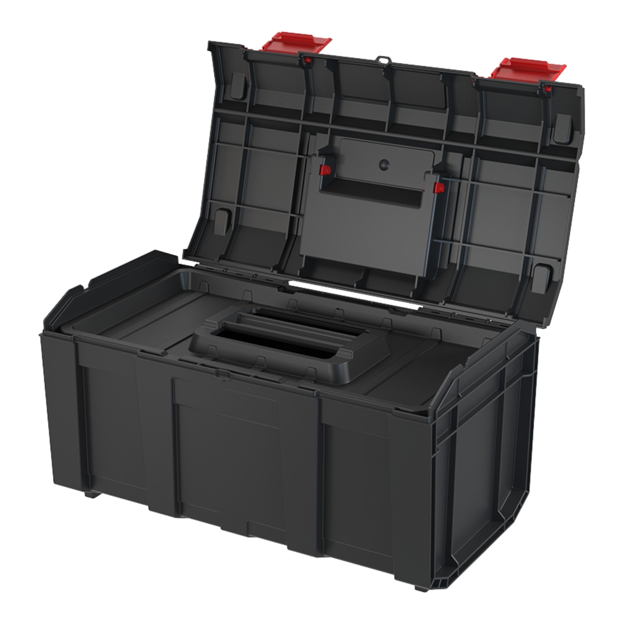 Qbrick Regular R-BOX 16 è una cassetta portautensili resistente e capiente, adatta sia per uso privato che professionale, che offre una maggiore sicurezza grazie alle pratiche scanalature di taglio e al foro per lucchetto; la struttura rinforzata con nervature di irrigidimento garantisce elevata stabilità e durata, mentre una maniglia ergonomica, chiusure robuste e un pratico vassoio interno aumentano il comfort dell'utente e consentono un'organizzazione ottimale del lavoro.