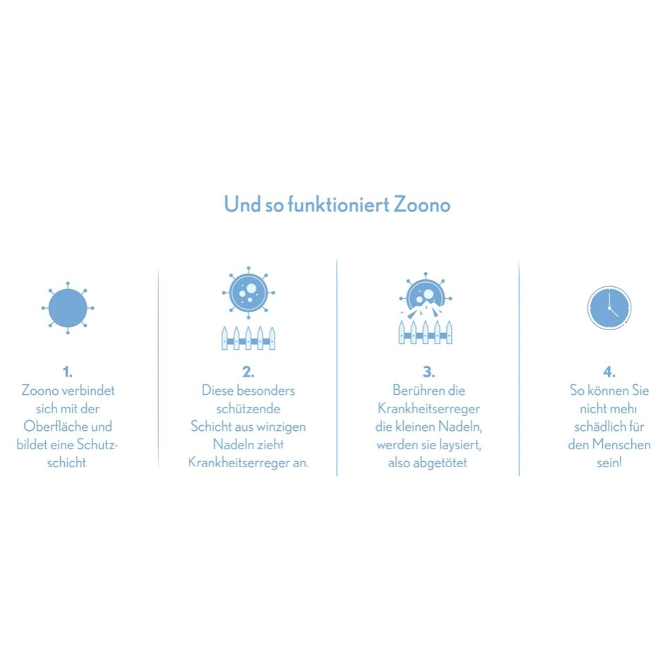 Il disinfettante per superfici Zoono ha una tecnologia che distrugge meccanicamente i germi, mettendo in ombra i prodotti antimicrobici. La maggior parte dei disinfettanti sono a base di alcol e altre sostanze chimiche e non sono quindi adatti alle superfici, al corpo o alla pelle. Il disinfettante per superfici Zoono, invece, è a base d'acqua, inodore e delicato per l'uomo e gli animali. La pellicola monomolecolare che si forma sulla superficie quando si utilizza il disinfettante per superfici è composta da polimeri antimicrobici a base di silano. Questi polimeri si legano in modo covalente alla superficie, formando una barriera di 'spilli' con carica positiva. Grazie alla carica positiva, gli agenti patogeni vengono attratti meccanicamente e distrutti mentre attraversano la parete cellulare. I perni rimangono sulle superfici per 15 giorni. Che si tratti di maniglie, rubinetti o altri punti di contatto utilizzati nella vita quotidiana, Zoono può essere utilizzato ovunque. Al giorno d'oggi, prevenire è meglio che monitorare, e il disinfettante Zoono può essere d'aiuto in questo senso.