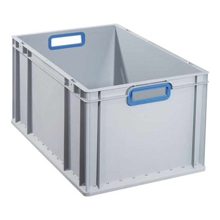 grau · formstabiles Polypropylen · rippenverstärkte Wände · abgestimmt auf Europaletten-Maße · selbstzentrierender, umlaufender Stapelrand · optimale Reinigung durch glatte Innenwände · widerstandsfähig gegen die meisten Säuren und Öle · Temperaturbeständig von -10 °C bis +60 °C · geschlossene Wände · blauer, offener Griff