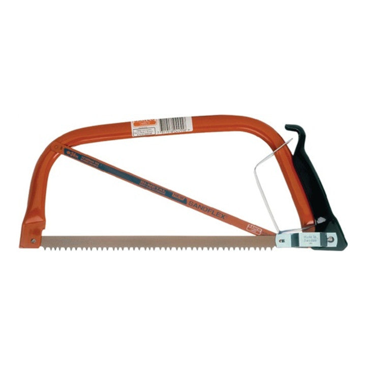 ovaler Rahmen aus stabilem Stahlrohr · mit Sägeblatt (spitzzahn) für Holz und Sandflex-Bimetall-Sägeblatt für Metall und Kunststoff · mit Kunststoff-Zahnschutz, Knöchelschutz und Spannhebel