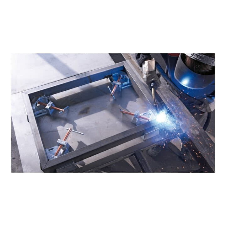 universell verwendbares Spannwerkzeug zum Fixieren rechtwinklig zueinander stehender Bauteile auch unterschiedlicher Dicke · Backen und Grundkörper aus hochwertigem Guß · Spindel verkupfert, deshalb speziell auch für Schweißarbeiten geeignet · durch die seitlichen Langlöcher leicht auf Schweißtischen und Maschinentischen zu befestigen · Winkelbereich: 5° - 180°
