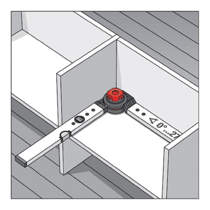 bestehend aus einer Alu-Profil-Wasserwaage mit einem variablen Alu-Profil-Schenkel · Wandstärke 1,6 mm · Messbereich 0 - 270° · die Indexscheibe des Gelenks kann in zwei verschiedenen Positionen eingelegt werden · danach können die Winkel wahlweise in 15°-Rasterung oder stufenlos eingestellt, fixiert und abgelesen werden