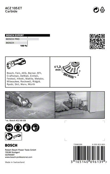 Das EXPERT Multi Material ACZ 105 ET Segmentsägeblatt bietet dank der Bosch Carbide Technology eine herausragende Lebensdauer in abrasiven Materialen und Verbundwerkstoffen. Dabei macht Sie eine zusätzliche Beschichtung nochmal Widerstandsfähiger, bis zu 50-mal längerer Lebensdauer als ein Bimetall Sägeblatt. Die dickere Konstruktion des Blattes sorgt für zusätzliche Robustheit und Stabilität. Dadurch werden präzise und gerade Schnitte gewährleistet. Zusätzlich sorgt die Starlock Aufnahme für eine maximale Kraftübertragung und bequemen Klingenwechsel innerhalb weniger Sekunden und ist dank des herstellerübergreifenden Aufnahmesystems mit vielen Maschinen einsetzbar. Das Bosch EXPERT Sortiment ist das innovativste Zubehör für Elektrowerkzeuge mit nachgewiesenen Leistungsvorteilen, um jeden Profi Handwerker höchst effizientes Arbeiten zu ermöglichen. Extrem lange Lebensdauer, maximale Präzision, arbeiten mit Höchstgeschwindigkeit und staubfreieres Schleifen: all das ist mit Bosch EXPERT möglich.