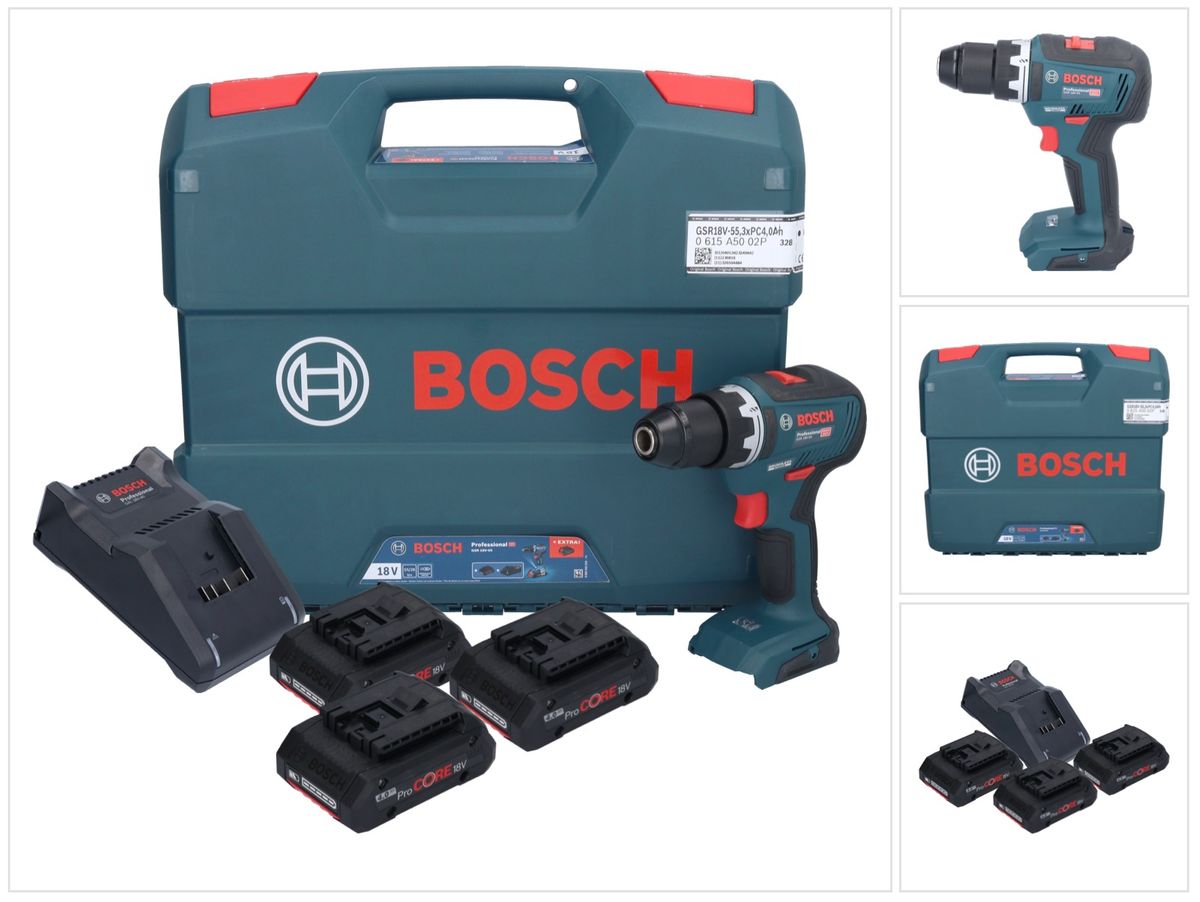 Bosch GSR 18V-55 Professional Akku Bohrschrauber 18 V 55 Nm Brushless ( 0615A5002P ) + 3x ProCORE Akku 4,0 Ah + Ladegerät + L-Case