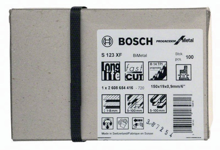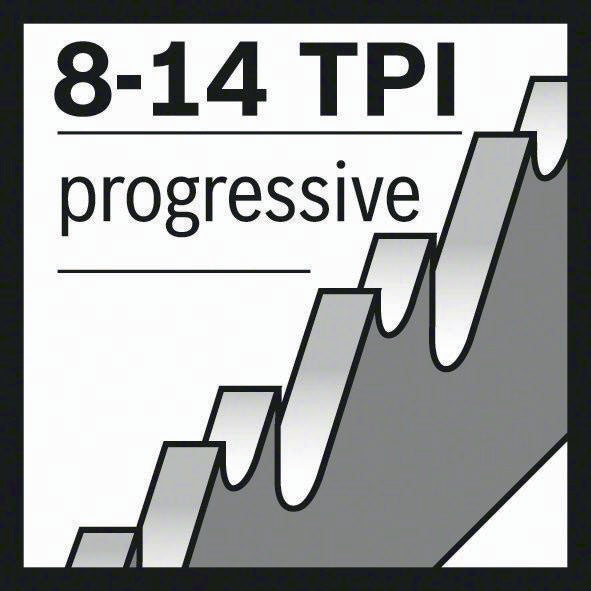 Progressor for Metal · Zahnausführung: geschränkt · gefräst · progressiv ansteigende Zahnteilung (1,8 – 3,2 mm) ermöglicht schnelle Schnitte in Material mit unterschiedlichen Dichten · Bimetallblatt für das Schneiden von Stahlrohren und -profilen mit normaler Stärke · spezielle Zahnform für das Schneiden von Stahl (1–8 mm) · Schnittleistung 100 mm (Standard-Blattlänge) · Einsatzbereiche: Für dünne bis starke Bleche (von 1 bis 8 mm Stärke) · für dünne bis kräftige Profile (mit Durchmesser kleiner als 100 mm)