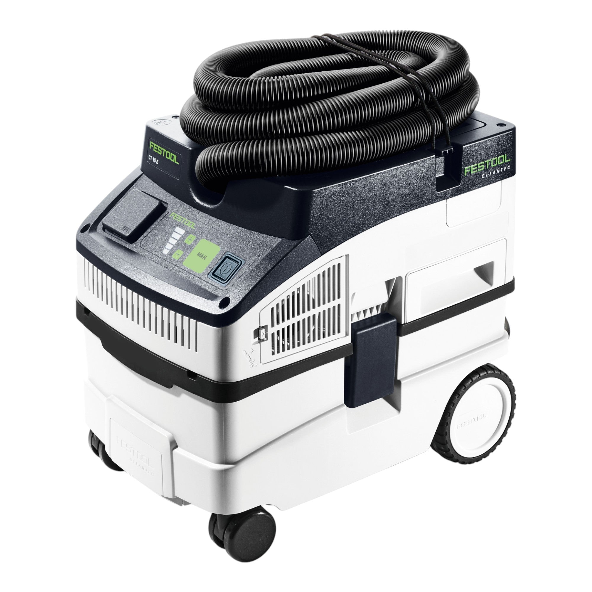 Das Festool CT 15 CLEANTEC Absaugmobil ist der ideale Begleiter für gründliche Reinigungsarbeiten in Werkstatt, Büro, Garage, auf der Baustelle oder am Fahrzeug – leistungsstark, kompakt und durchdacht in jedem Detail. Mit einem großzügigen 15-Liter-Behältervolumen, das dank der optimierten Bauform vollständig nutzbar ist, ermöglicht der CT 15 langes Arbeiten ohne häufigen Filtersackwechsel und saugt dabei zuverlässig Staub, Schmutz und sogar Wasser. Das robuste Fahrwerk, das geringe Gewicht und die kompakten Maße machen ihn besonders mobil und ideal für den flexiblen Einsatz unterwegs. Die intuitive Touch-Bedienung ermöglicht eine einfache Steuerung, während die fünfstufige Saugkraftregulierung für optimale Anpassung an jede Anwendung sorgt. Praktisch: Eine flache Ablagefläche dient als Ablage für Werkzeuge oder Materialien, und das enthaltene Reinigungszubehör ist direkt im Gerät untergebracht – sofort griffbereit. Der Hauptfilter lässt sich bequem von außen wechseln, und die integrierte Antistatik-Funktion schützt zuverlässig vor statischer Aufladung beim Arbeiten.