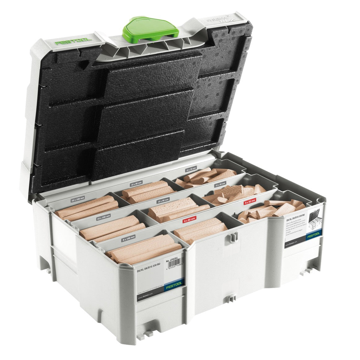 Das Festool Domino Dübel Sortiment besteht aus 306 Domino Dübeln in verschiedenen Größen. Die Dübel sind aus massivem Hartholz gefertigt, wodurch stabile und kraftschlüssige Verbindungen ermöglicht werden. Die Domino Dübel vereinen die Vorteile von runden und flachen Dübeln, durch die quellenden Leimtaschen und seitlichen Längsrippen wird eine optimale Passgenauigkeit erreicht. Die Verbindungen sind absolut verdrehsicher ab dem ersten Dübel. Die mitgelieferten Domino XL Fräser für die Größen 8 und 10 ermöglichen exakte Dübelfräsungen für die Domino Dübel.