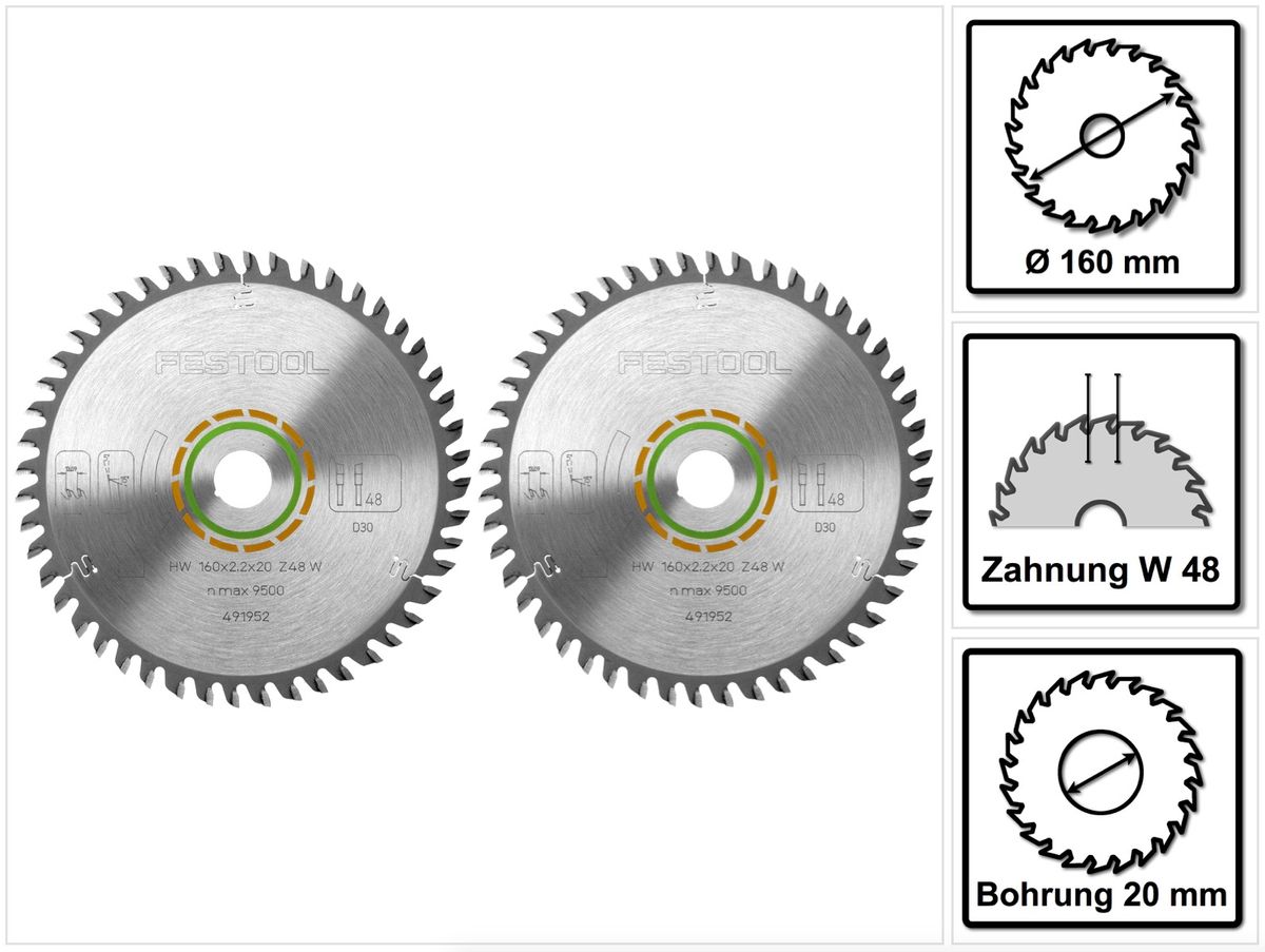 - 2x Festool Feinzahn Kreissägeblatt HW 160x2,2x20 W48 ( 491952 )