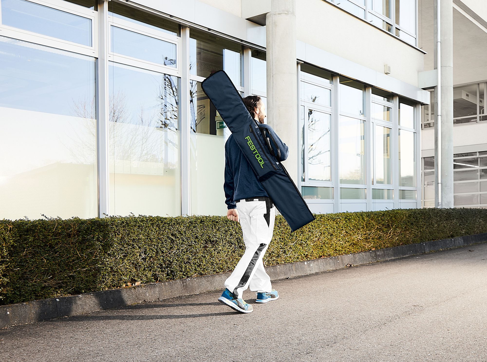 Mit der Führungsschienentasche werden Führungsschienen perfekt geschützt, transportiert und aufbewahrt. Die Taschen haben ein großes Hauptfach, in dem ein oder zwei Führungsschienen bis zu einer Länge von 3000 mm untergebracht werden können. Zusätzlich existiert eine weitere Tasche, in der Zubehör wie Verbinder, Schraubzwingen oder der Winkelanschlag FS-WA/90° Platz findet.
