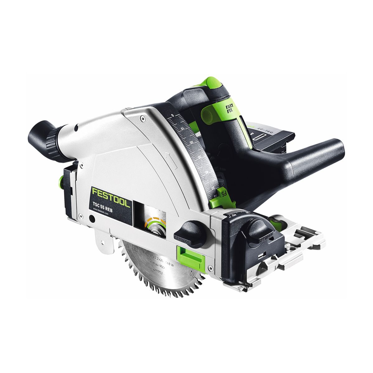 Die Festool Akku-Tauchsäge TSC 55 REB-Li ist ideal für präzise Tauchschnitte bei einer Materialstärke von bis zu 55 mm und eignet sich perfekt für das Ablängen von Innentüren, zum Sägen von Aussparungen in Türen und Küchenarbeitsplatten, Zuschneiden von Plattenmaterial und zum Herstellen von Dehnungsfugen in Parkettböden und Schattenfugen. Die TSC 55 REB-Li Tauchsäge überzeugt mit dem 36V (2x 18V) starken, bürstenlosen EC-TEC Motor mit Lithium-Ionen-Technologie. Durch den leistungsstarken Motor werden sehr hohe Drehzahlen (bis zu 5.200 min-1) und somit eine perfekte Schnittqualität bei einem schnellen Arbeitsfortschritt erreicht. Der mitgelieferte Staubfangbeutel ermöglicht schmutzfreies und emmissionsloses Arbeiten und mit der neuen FastFix-Generation lässt sich das Sägeblatt einfach und schnell wechseln.