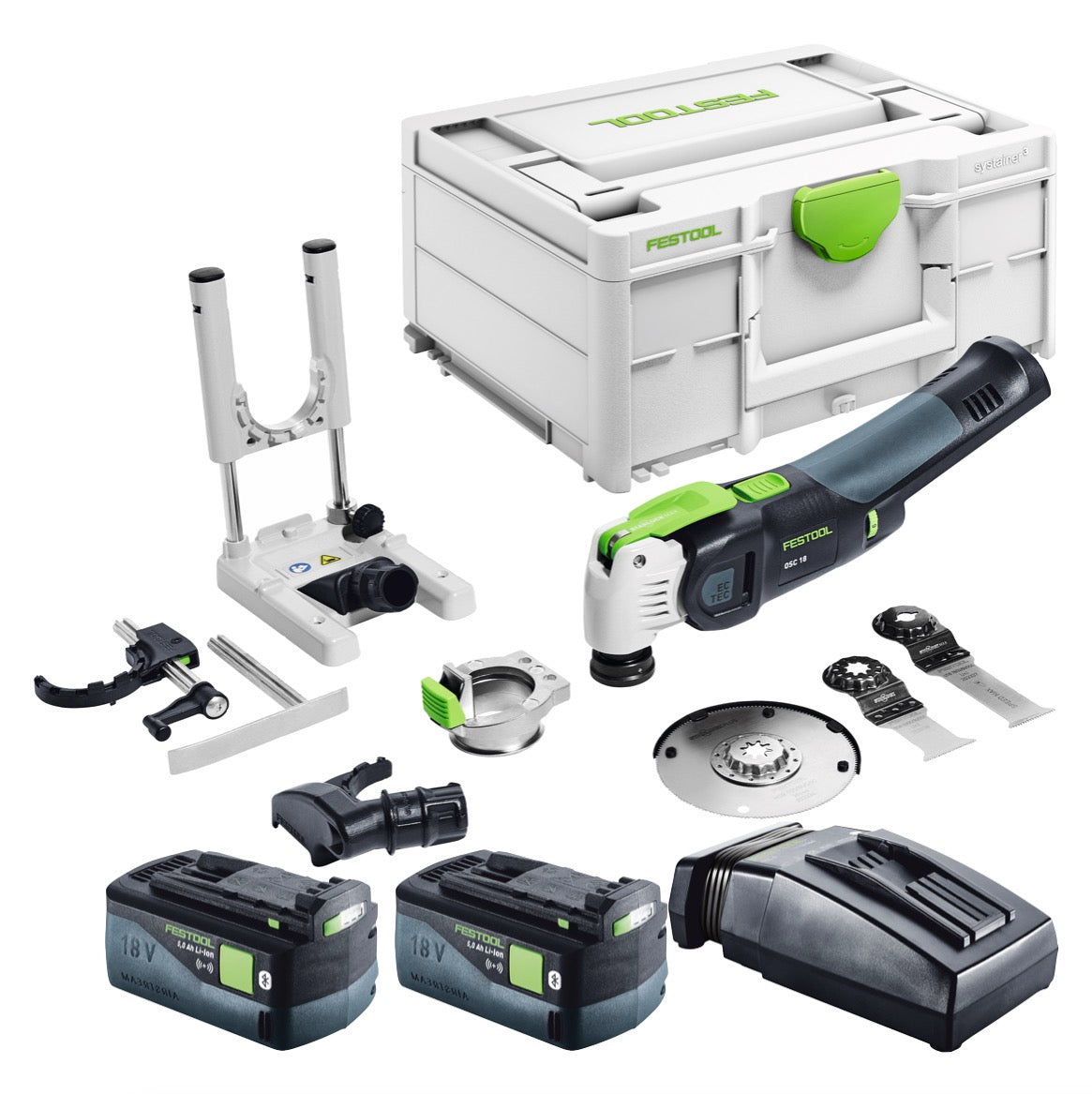 Festool VECTURO OSC 18 E-Basic Set Akku Oszillierer 18 V Starlock Max Brushless + 2x Akku 5,0 Ah + Ladegerät + 7 tlg. Zubehör Set + Systainer