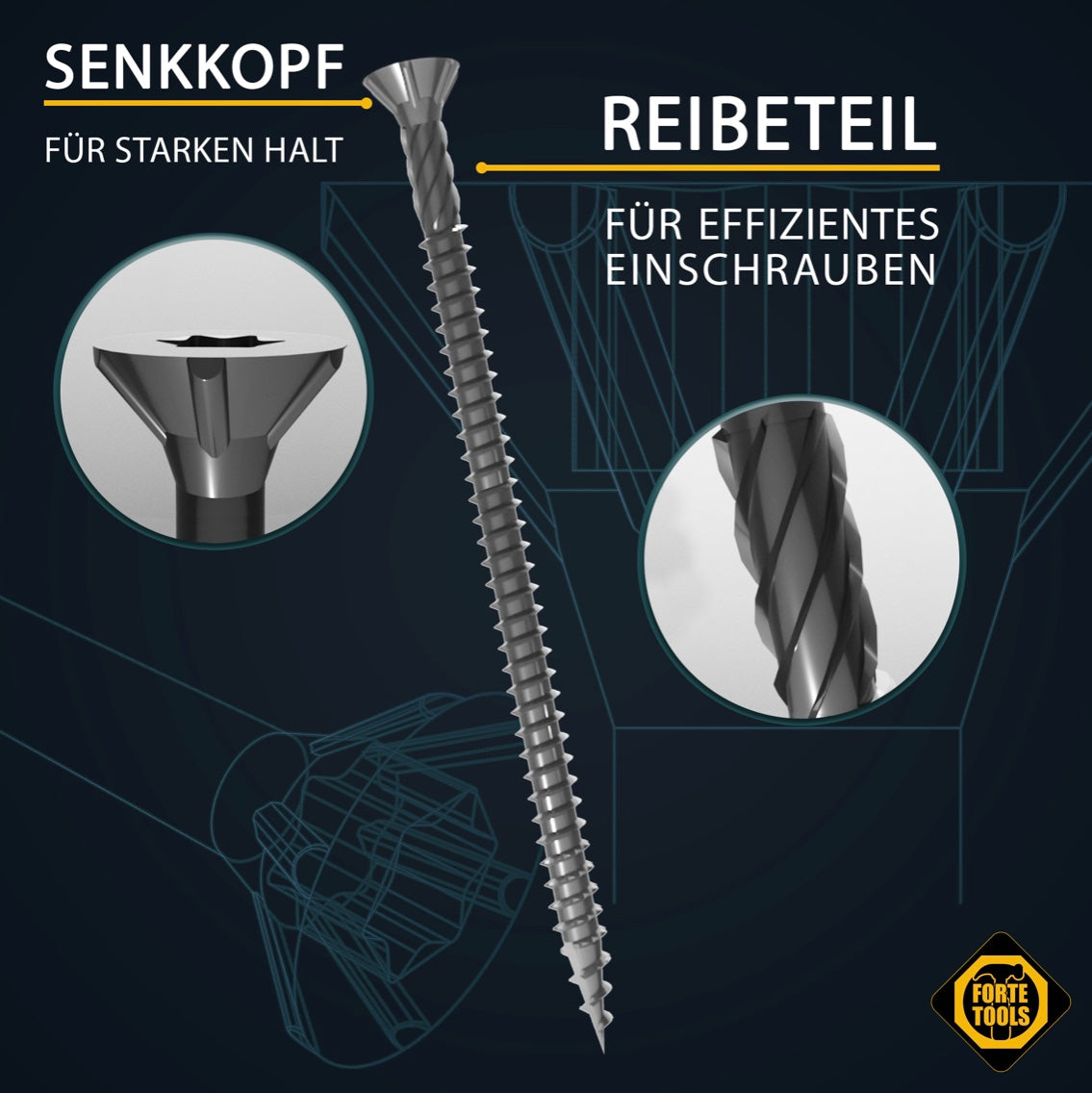 Die FORTE Tools Holzschraube mit Torx Aufnahme garantiert dem Anwender eine hohe Flexibilität durch universelle Einsetzbarkeit in unterschiedlichen Materialien wie Holz, Kunststoff oder Metallblech. Der Senkkopf sorgt für eine saubere und bündige Versenkung der Schraube in Holz. Die Torx Aufnahme erlaubt eine bessere Kraftübertragung auf die Schraube, höhere Standzeiten sowie ein schnelleres Einfädeln der Schraube mit zugleich besserem Passsitz am Werkstück. Zusätzlich sorgt das Wellenprofil am vorderen Gewinde für ein leichtes und sicheres Verschrauben. Die Verzinkung sorgt für einen Korrosionsschutz und eine deutlich höhere Oberflächenhärte als herkömmliche blanke Schrauben, wodurch sich die Einsatzmöglichkeiten um ein vielfaches im Außenbereich erweitern lassen.