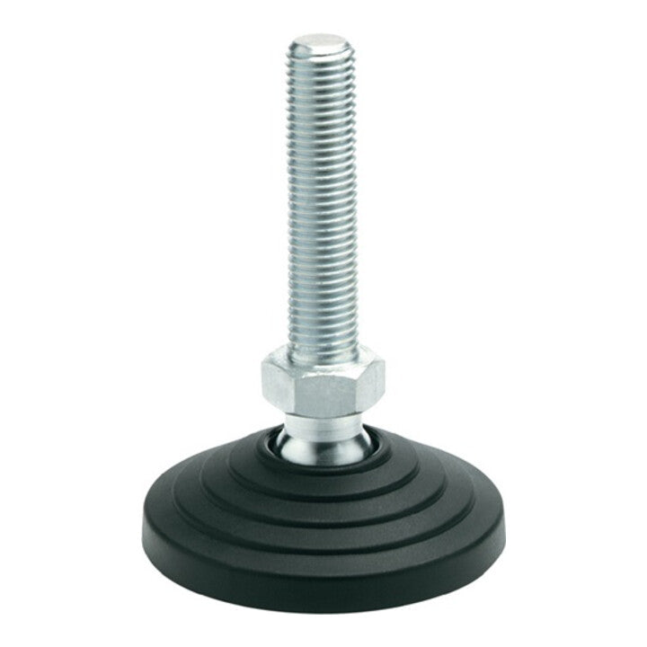 mit Mutter, mit Gummiauflage · die in der Tabelle angegebenen Werte der statischen Belastbarkeit sind Richtwerte, bei deren Überschreitung es zur bleibenden Verformung bzw. zum Bruch des Kunststofftellers kommen kann · Ausführung: Fuß Kunststoff Thermoplast (Polyamid PA), glasfaserverstärkt, schwarz, matt, temperaturbeständig bis 100 °C · Verstellspindel Stahl verzinkt, blau passiviert · Festigkeitsklasse 5.8 · Sechskantmutter ISO 4032: Stahl verzinkt, blau passiviert · Gummiauflage (NBR): 70 Shore A, schwarz weitere Ausführungen auf Anfrage