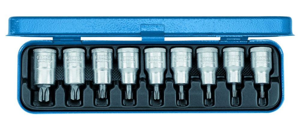 12,5 mm (1/2 ″)-Vierkantantrieb · für Schrauben mit Innen-TORX®-Profil · Steckschlüssel-Einsätze aus CV-Stahl · Klingen aus Vanadium-Sonderstahl brüniert · gerändelt Inhalt: je 1 Steckschlüssel-Einsatz für Schrauben mit Innen-TORX®-Profil Gr. T 20 / 25 / 27 / 30 / 40 / 45 / 50 / 55 / 60