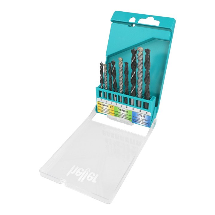 für Stein, Metall und Holz · enthält die gängigsten Bohrer für Holz-, Metall- und Steinanwendungen Inhalt: je 1 St. Steinbohrer Ø 5, 6, 8 mm je 1 St. HSS-Bohrer rollgewalzt Ø 5, 6, 8 mm je 1 St. Holzbohrer Ø 5, 6, 8 mm