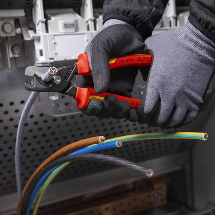 VDE-isoliert bis 1000 V · gefertigt gem. DIN EN/IEC 60900, stückgeprüft · mit Kraftgelenk · langen Schenkeln und optimierten Schneiden: bis zu 60 % leichterer Schnitt als mit kompakten Kabelscheren · enorme Kapazität: trennt eindrähtige Kabel aus Kupfer oder Aluminium bis 35 mm² · mehrdrähtig bis 70 mm² und feindrähtig bis 120 mm² · zwei Schneidbereiche: die abgestufte Hauptschneide hält kleinere und größere Kabel beim Schnitt stets maximal gelenknah · die Frontschneide dient zum schrittweisen Trennen („Knabbern”) sehr großer Kabel · komfortable Einhand- und Zweihandbedienung auch bei großen Kabeldurchmessern durch minimierte Schenkelweite · geschraubtes Kraftgelenk: hochübersetzt · leichtgängig · nachstellbar · schlanker Kopf für bessere Zugänglichkeit · mit Klemmschutz für sicheres Arbeiten · nicht geeignet für stahlverstärkte Kabel, etwa ACSR · Schneiden zusätzlich lasergehärtet · Schneidenhärte ca. 56 HRC