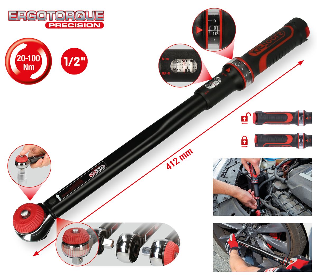 1/2" ERGOTORQUE®precision Ratschen-Drehmomentschlüssel Drehknopf, 20-100Nm · ERGOTORQUE®precision Drehmomentschlüssel mit Drehknopf-Umsteck-Ratschenkopf