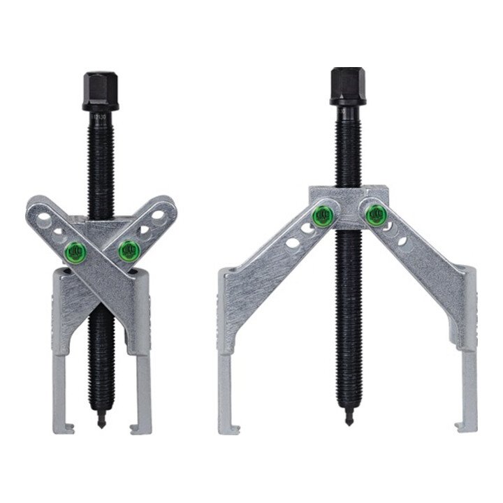 verstellbar · mit selbstsichernden Haltestiften zum individuellen Einstellen der Spannweite und Spanntiefe · selbstspannend · einfache Handhabung Anwendung: zum Abziehen von Ritzeln, Lagern und ähnlichen Teilen bei engen Platzverhältnissen