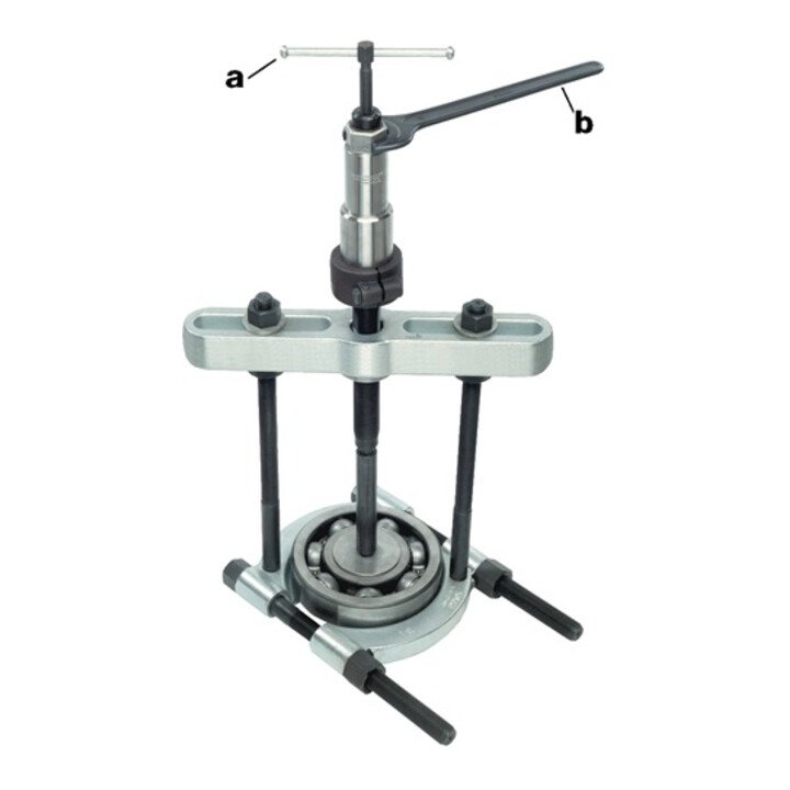 Anwendung: zum Abziehen von Kugellagern, Rollenlagern, Innenringen und anderen bündig aufsitzenden Teilen · die scharfen Schneiden ermöglichen das Abziehen bündig aufliegender Teile, wo 2- und 3- armige Abzieher unanwendbar sind (Abb. 1) · das Spannen der Trennbacken erfolgt durch gleichmäßiges Abziehen der Muttern auf den Seitenbolzen Arbeitsweise: das Abziehen erfolgt durch Anziehen der Spindel gegen das Wellenende (Abbildung 2 und 3), bei den größeren Abziehvorrichtungen ist auch hydraulische Arbeitsweise möglich Arbeitsweise mit Hydraulik (Abbildung 4): (Hydraulik gehört nicht zum Lieferumfang) mit dem Schlüssel (b) die Spindel der Hydraulik in das Gewinde der Traverse der Abziehvorrichtung schrauben · bis sich das Druckstück fest gegen die Welle presst, dann durch Drehen der oberen Spindel (a) die Hydraulik in Tätigkeit setzen · Achtung: die Abbildungen 2 und 3 zeigen die Trennvorrichtung in Kombination mit der Abziehvorrichtung Art.-Nr. 4157 490 000, 4157 490 001, 4157 490 002, 4157 490 003 (gehört nicht zum Lieferumfang) die Abbildung 4 zeigt die Trennvorrichtung in Kombination mit der Abziehvorrichtung Art.-Nr. 4157 490 000, 4157 490 001, 4157 490 002, 4157 490 003 und einer Hydraulikspindel (Abziehvorrichtung und Hydraulikspindel gehören nicht zum Lieferumfang) Hydraulikspindel bitte separat anfragen