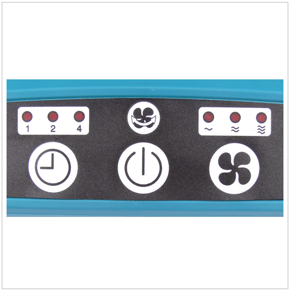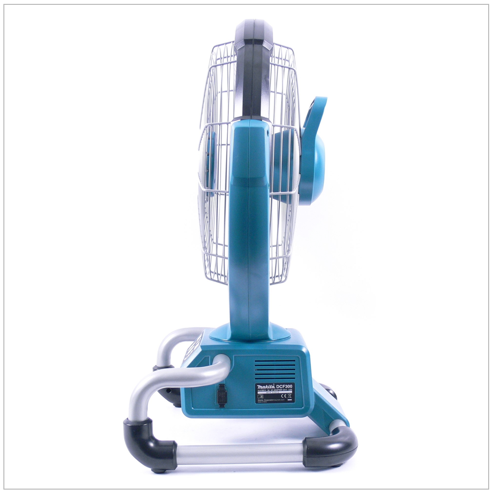 Der Makita DCF 300 verfügt über 3 Windgeschwindigkeitsstufen, die maximale Luftgeschwindigkeit beträgt 220 m/min. Der Ventilator ist von 45° bis -45° neigbar, zusätzlich schwenkt der Ventilator automatisch 45° rechts bis 45° links. Zusätzlich gibt es eine Timerfunktion, mit dieser kann der Ventilator nach 1, 2 oder 4 Stunden ausgeschaltet werden. Das Gehäuse mit stabilem Metallrahmen reduziert merklich die Windgeräusche. Der DCF 300 Ventilator lässt sich sowohl mit 14,4 V und 18 V Li-Ion Akkus betreiben, aber auch mit dem im Lieferumfang enthaltenen Netzteil über Netzbetrieb.